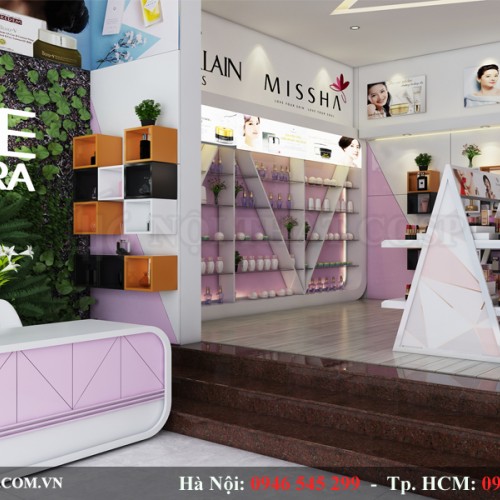 Với yêu cầu của chị Huê, đội ngũ thiết kế Nội Thất Cosp lựa chọn gam màu hồng và trắng là tông màu chủ đạo cho shop mỹ phẩm. Tông màu này mang đến sự tinh tế, nhẹ nhàng mang tới một không gian lãng mạn, trẻ trung và tươi sáng.