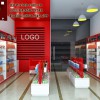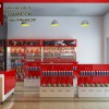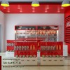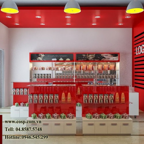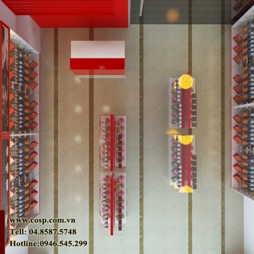 Với diện tích mặt sàn là 40m2 nội thất của cửa hàng gồm 2 tủ đặt sát tường, 4 kệ giữa nhà cùng 1 quầy thu ngân. Tất cả tủ kệ đều theo một gam màu là đỏ và trắng. Tủ sát tường với thiết kế khung gỗ, mặt trước và các đợt ngăn các tầng nhỏ đều được sử dụng chất liệu kính trong suốt.