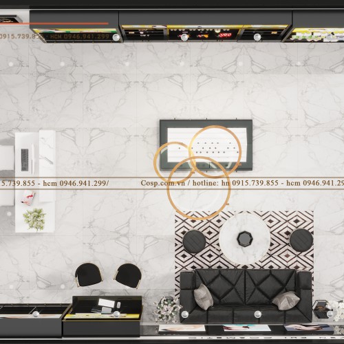 Sofa dài khung gỗ tự nhiên được bọc da và đi viền alu vàng gương cao cấp kết hợp với bàn trà mặt đá marble tạo nên tổng thể thiết kế cửa hàng hài hòa, cân đối.