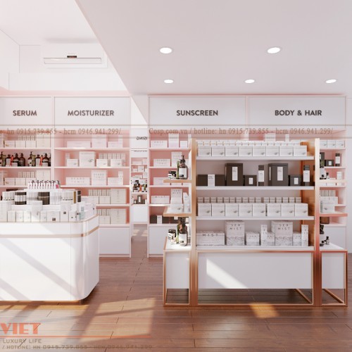 Tiếp đến là hệ tủ đạo giữa nhà, Tủ lửng được đặt giữa nhà tạo ra lối đi chung cho mẫu thiết kế cửa hàng mỹ phẩm. Tủ này cũng được làm bằng gỗ MDF phun sơn 2k. Xung quanh tủ có các viền nhôm, phía trên là các kệ rời để mỹ phẩm nổi bật. Vẫn ở giữa nhà là một kệ trưng bày với khung sắt gia cố mạ vàng nữa.