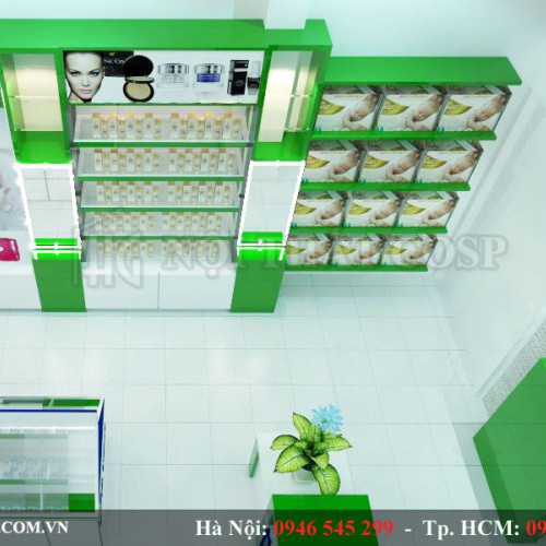Sử dụng chất liệu gỗ MDF cao cấp, hệ thống tủ kệ trưng bày trong shop được thiết với kiểu dáng sang trọng và đa năng với nhiều ngăn học thuận tiện cho việc trưng bày các dòng mỹ phẩm trong shop.