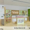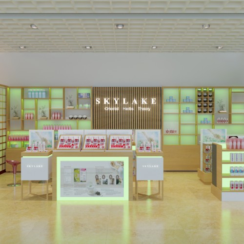 Hệ thống tủ trưng bày trong nội thất shop mỹ phẩm được thiết kế nhỏ nhắn phù hợp với không gian cửa hàng. Các tủ được bố trí quay ra ngoài để show sản phẩm, thu hút khách hàng qua lại trong trung tâm thương mại. Màu sắc được sử dụng cho các tủ kệ là màu trắng giúp tăng thêm nét trẻ trung, trang nhã và dịu dàng cho thiết kế nội thất cửa hàng. Tủ trưng bày được thiết kế nhiều ngăn, tầng để giúp trưng bày sản phẩm tiện lợi hơn bởi các sản phẩm mỹ phẩm thường có kích thước nhỏ nhắn với trọng lượng không lớn.