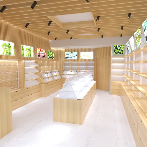 Cùng với đó là hệ thống tủ trưng bày cũng được làm từ chất liệu gỗ tự nhiên cao cấp được kê sát tường nhằm tạo lối đi thuận tiện cho khách hàng dễ dàng di chuyển.