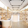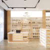Góc bên phải của cửa hàng được setup hệ thống giá kệ cao sát trần nhà màu vàng gold. Sự đồng điệu về màu sắc sẽ mang đến tổng thể không gian có sự chuyên nghiệp, hài hòa. Các ngăn tủ được tính toán diện tích hợp lý, có đèn LED chiếu sáng để làm nổi bật mặt hàng mỹ phẩm. Phía trán kệ còn có các hộp tranh trang trí phát sáng ấn tượng làm sáng bừng cả không gian.