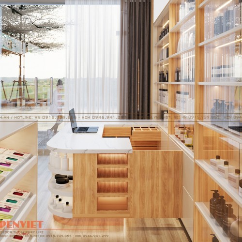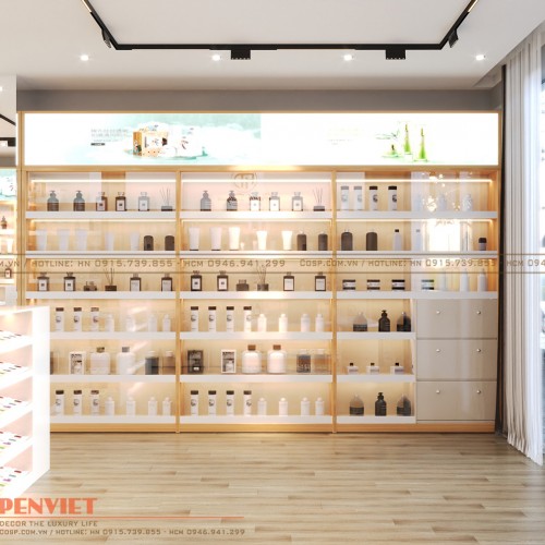 Bạn sở hữu cửa hàng chuyên kinh doanh mặt hàng mỹ phẩm nhưng muốn làm mới không gian nội thất để tăng thu hút khách hàng? Hãy tham khảo mẫu thiết kế shop mỹ phẩm Hạnh Duyên của PenViet với nhiều điểm nhấn ấn tượng. Cửa hàng được trang trí theo phong cách hiện đại, màu sắc tươi trẻ tăng cảm hứng mua sắm cho người tiêu dùng.