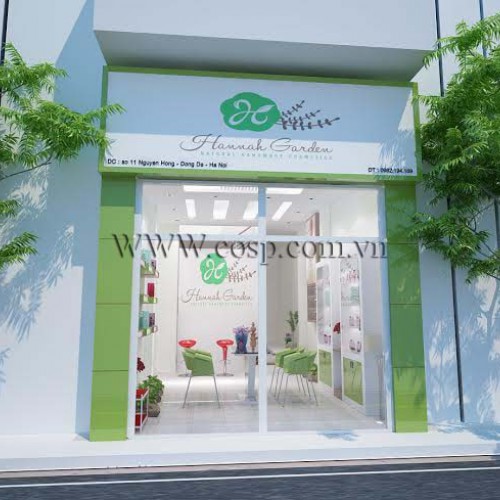 Shop mỹ phẩm Hannah Garden nổi bật nhờ sự trẻ trung, hiện đại thể hiện qua thiết kế mặt tiền đơn giản và phối hợp màu sắc ăn ý. Hộp logo được viền bằng Alu làm tôn lên logo và tên cửa hàng bằng Mica cắt CNC.