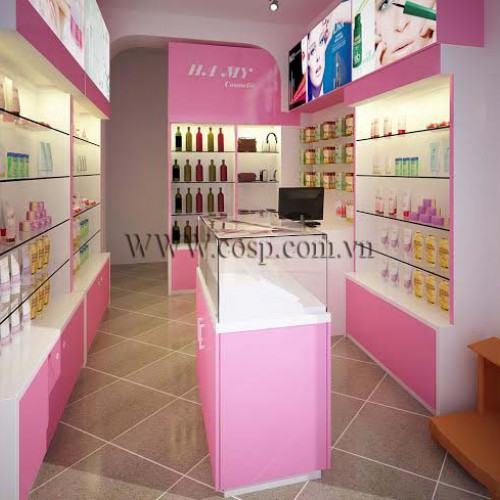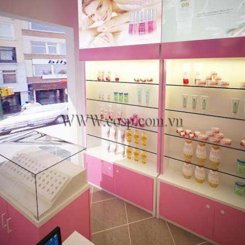 Những chiếc tủ trưng bày giữa nhà và kệ sát tường có lớp kính làm thành các đợt để mỹ phẩm, lớp kính bao phủ bên ngoài giúp cho sản phẩm sang trọng và cao cấp hơn.