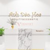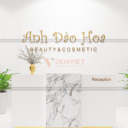 Bức vách logo phía sau được làm từ chất liệu MDF 6mm phủ PVD giả đá vân mây cùng nẹp kim loại mạ vàng gold. Bộ chữ thương hiệu “Anh Đào Hoa – Beauty & Cosmetic” được làm bằng chất liệu alu vàng gương gắn chân fomex nổi bật trên nền trắng tinh khôi.
