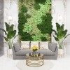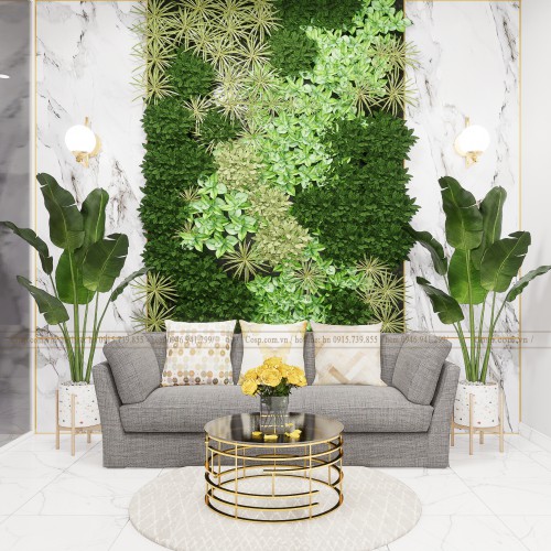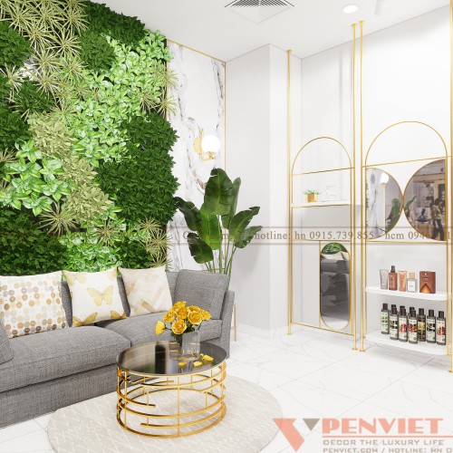 Ngoài ra, một bộ sofa với khung gỗ tự nhiên bọc đệm mút nỉ Việt Nhật cũng được đặt thêm vào không gian của shop mỹ phẩm Anh Đào Hoa. Bộ sofa này tạo chỗ ngồi thoải mái cho khách hàng khi đến với shop, mang đến những trải nghiệm tốt nhất. Bức vách phía sau sofa được làm bằng khung gắn cây nhựa và decor theo thiết kế.