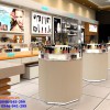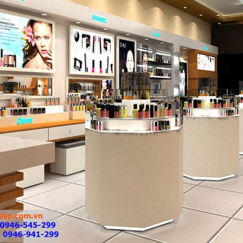 1bên là hệ thống kệ với thiết kế cách điệu, uốn lượn hình sóng biển rất tự nhiên, và chính giữa cửa hàng là những kệ bày mỹ phẩm dạng tròn với chiều cao vừa phải để khách dễ dàng tham quan và thử sản phẩm. Với thiết kế khác biệt giữa 2 bên đã đem lại nét mềm mại, nữ tính cho cửa hàng.