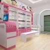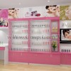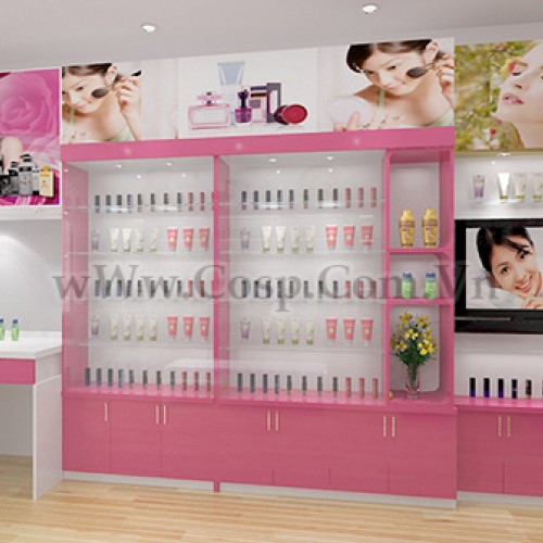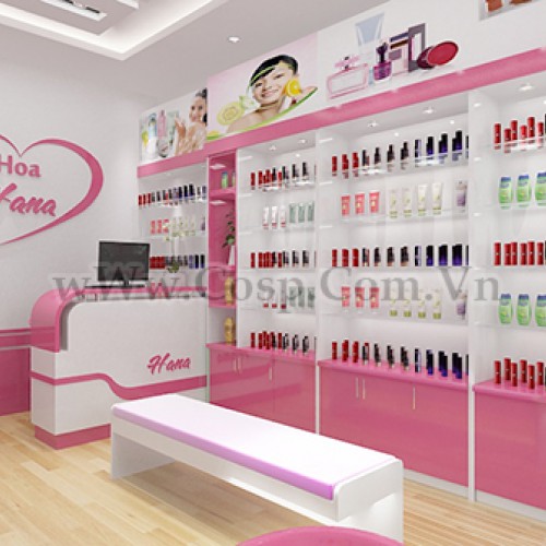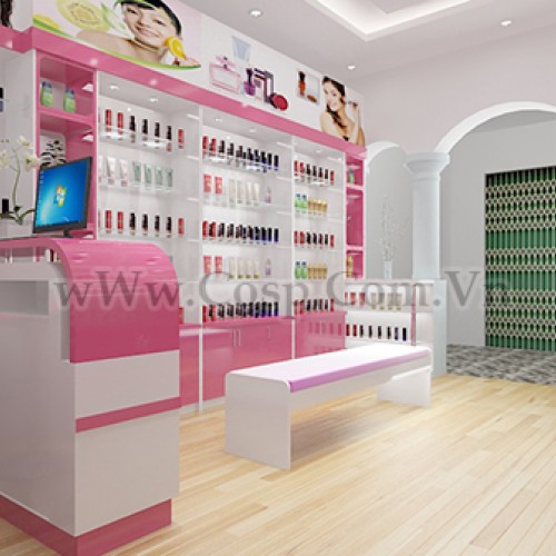 Một vẻ đẹp quyến rủ khi ta bước chân vào cửa hàng. Màu sắc rất ưng ý, các chị em phụ nữ chắc chắn thích vì sự kết hợp màu sắc tuyệt vời này. Màu hồng kết hợp trắng một cách thông minh cùng với nội thất sin xò đã khiến cho mẫu thiết kế shop mỹ phẩm đẹp tuyệt vời.