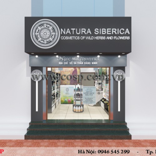 Thiết kế shop mỹ phẩm của chị Ngọc kinh doanh chủ yếu các sản phẩm của thương hiệu mỹ phẩm Naura Siberica. Đây là một dòng mỹ phẩm hoàn toàn tự nhiên và có nguồn gốc thảo dược. Muốn hướng tới sự mộc mạc từ các chất liệu tạo ra các sản phẩm shop bày bán, thiết kế cửa hàng mỹ phẩm toàn bộ mặt tiền shop sử dụng màu xám làm toát lên nét giản dị, mộc mạc.