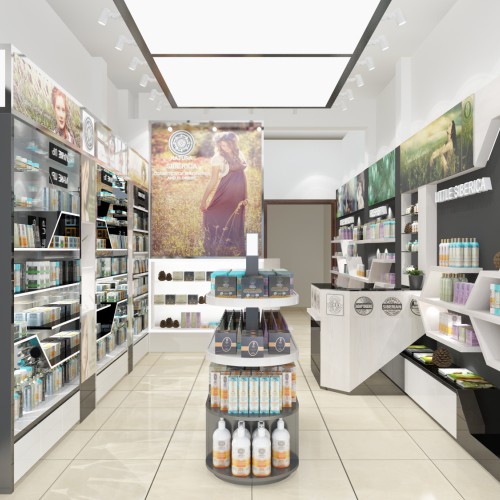 Không gian nội thất trong thiết kế shop mỹ phẩm đẹp được tận dụng tối đa để trưng bày sản phẩm.