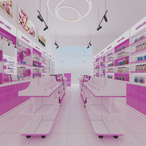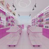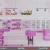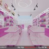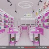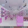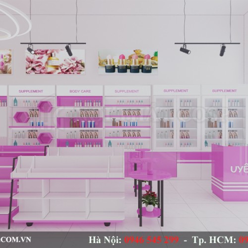 Với gam màu hồng nhạt xen kẽ với gam màu trắng tạo nên nét đẹp dịu dàng, đầy quyến rũ cho thiết kế cửa hàng mỹ phẩm Uyên xinh này.