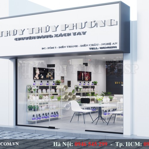Thiết kế cửa hàng mỹ phẩm với phong cách hiện đại, không gian phía bên trong shop được sắp xếp khoa học. Tủ trưng bày sản phẩm được thiết kế với kiểu dáng sang trọng làm nổi bật các sản phẩm mỹ phẩm trong shop của chị Phương.