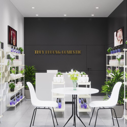 Với gam màu trắng - đen tương phản là tông màu chủ đạo giúp không gian shop mỹ phẩm càng nổi bật và thu hút hơn. Đặc biệt, việc sử dụng những chậu cây nhỏ trang trí cùng những bức tranh người mẫu mang lại hiệu ứng thu hút khách hàng. Không gian mộc mạc, gần gũi sẽ là điểm cộng dành cho shop mỹ phẩm chị Phương.