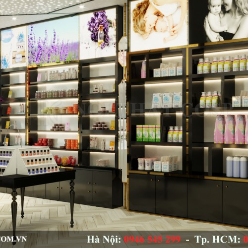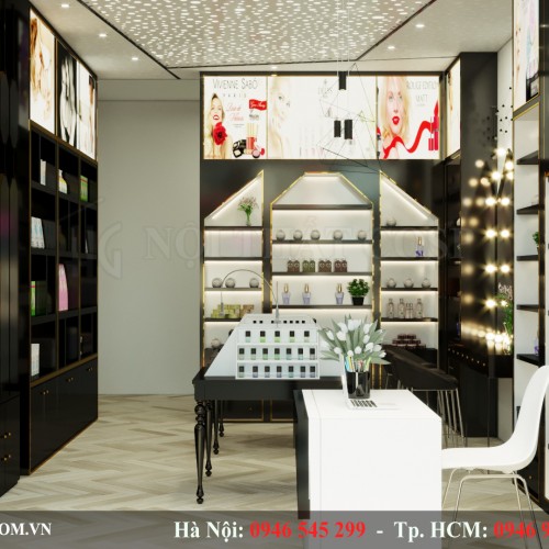 Thiết kế shop mỹ phẩm H&T chị Tuyết với phong cách hiện đại, gam màu đen bí ẩn cùng sự kết hợp giữa màu vàng đồng và trắng tạo sự thu hút độc đáo tới khách hàng ngay từ ánh mắt đầu tiên.