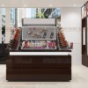 Vẫn sử dụng loại gỗ công nghiệp nhưng cao cấp là MDF chống ẩm Thái Lan phủ Melamine làm vật liệu chính, chiếc tủ có các đượt bằng kính sang trọng. Tủ không thể thiếu đèn led chiếu sáng trong, tranh poster nổi bật phía bên trên trán tủ được.