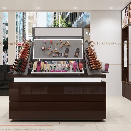 Ngoài ra, viền tủ được bọc inox mạ vàng giúp cho tủ thêm đẹp hơn. Nhiều ngăn tủ có kích thước khác nhau giúp cho cửa hàng mỹ phẩm đẹp trưng bày được nhiều loại mỹ phẩm khác nhau.