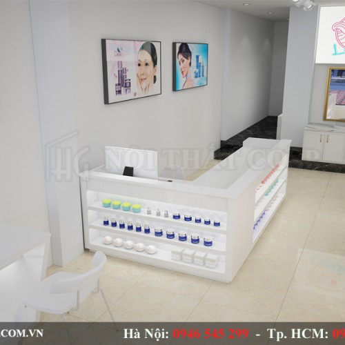 Nội thất của shop mỹ phẩm được tạo dựng lên từ những chất liệu quen thuộc như: gỗ mdf sơn 2k... nhưng chính cách kết hợp hiệu quả của các KTS mà shop mỹ phẩm của Anh Hiếu đầu tư đã để lại một ấn tượng rất tốt về thẩm mỹ với những khách hàng đến đâu mua sắm dù chỉ một lần.