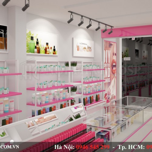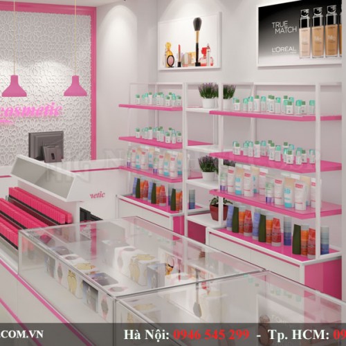Đồng thời, khiến không shop của mẫu thiết kế cửa hàng mỹ phẩm trở nên quyến rũ và lôi cuốn khách hàng. Với sự phối màu tinh tế và khéo léo đan xen giữa các gam màu hồng khiến cửa hàng mỹ phẩm của chị bắt mắt và nổi bật hơn.