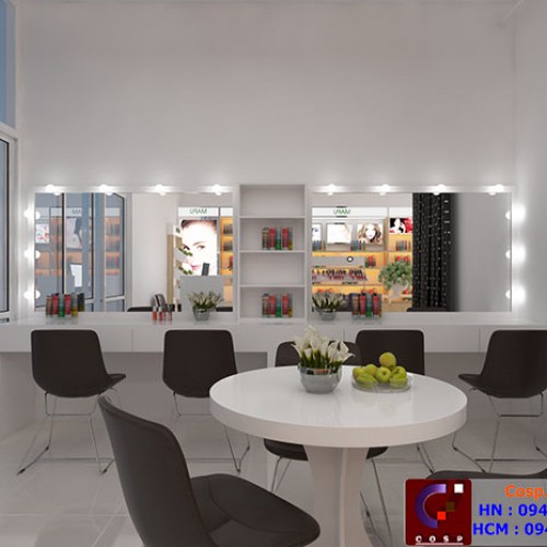 Được đặt ở phía cuối và bên trái quầy thu ngân với hệ thống bàn, ghế màu trắng đen đơn giản bắt mắt. Hệ thống đèn xung quanh gương để đảm bảo ánh sáng tốt nhất khi khách hàng sử dụng sản phẩm tại đây. Tại đây khách hàng có thể thoải mái tận hưởng cảm giác làm đẹp cho bản thân và giúp thương hiệu bạn ghi thêm điểm trong mắt của họ.
