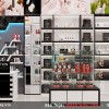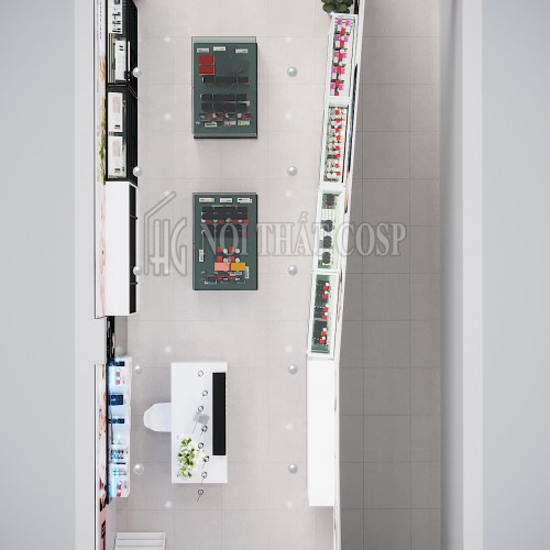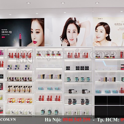 Hệ nội thất sử dụng trong thiết kế shop mỹ phẩm nhỏ đẹp này bao gồm: hệ tủ trưng bày giữa nhà và kệ tủ trưng bày sát tường. Cách hệ kệ và tủ trưng bày đều được thiết kế đơn giản với nhiều ngăn nhỏ để phân loại sản phẩm. Chất liệu được sử dụng cho hệ tủ kệ là MDF phun sưn 07 sáng bóng và bền màu.