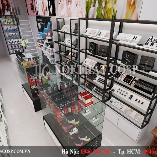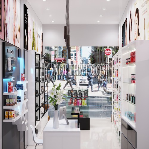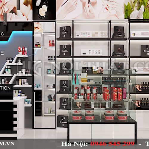 Thiết kế shop mỹ phẩm phong cách hiện đại tôn lên sự sang trọng cho không gian shop và các sản phẩm mỹ phẩm cao cấp.