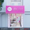 Phần biển bảng được làm từ tấm alu khung sắt sơn tĩnh điện kết hợp với chữ mica in nổi phát sáng chân màu trắng tạo sự nổi bật trên nền biển màu hồng xinh xắn. Bên cạnh đó, cửa ra vào được sử dụng hoàn toàn là kính cường lực, giúp tạo không gian mở và mang lại cảm giác rộng thoáng cho cửa hàng. Đây là giải pháp thiết kế rất phù hợp với một cửa hàng có diện tích nhỏ hẹp như Miu Xinh.