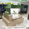 Thiết bị kệ giữa nhà với phong cách độc đáo, tính thẩm mỹ cao với các đường cắt nghệ thuật. Tuy nhiên vẫn đảm bảo không gian sử dụng và di chuyển trong cửa hàng. Một mẫu thiết kế shop mỹ phẩm đẹp chính là thể hiện được sự độc đáo của nội thất mà vẫn đảm bảo công năng tối đa cho cửa hàng mỹ phẩm.