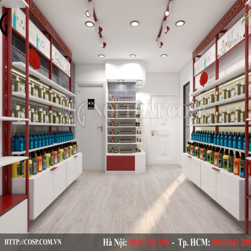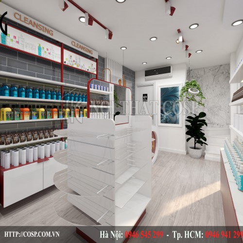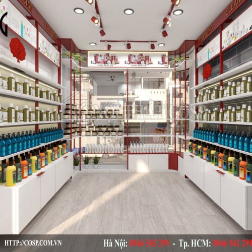 Hệ nội thất bao gồm tủ trưng bày được thiết kế từ chất liệu gỗ MDF cao cấp kết hợp cùng với sắt sơn tĩnh điện. Đây đều là những chất liệu có độ bền cao, chắc chắn, có khả năng chống thấm nước, chống mối mọt nên rất phù hợp cho các thiết kế cửa hàng mỹ phẩm.