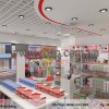 Trần nhà được thiết kế dạng thoáng có tác dụng giảm ồn và hút ẩm tốt. Đồng thời các thiết kế shop mỹ phẩm như thế này cũng rất độc đáo, mới lạ, mang tới nét cá tính, riêng biệt cho không gian thiết kế cửa hàng. Trần nhà được làm bằng gỗ màu trắng, kết hợp hài hòa với màu sắc tổng thể của mẫu thiet ke shop my pham.