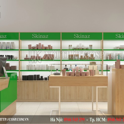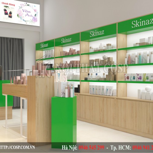 Kệ để hàng sử dụng chất liệu gỗ MDF sơn 07 mang lại cảm giác sang trọng và tinh tế, chất liệu gỗ nhẹ nhàng tạo sự linh hoạt cần thiết cho shop mỹ phẩm, hệ thống đèn chiều sáng được lựa chọn cẩn thận để làm nổi bật sản phẩm và tạo cảm giác ấm cúng.