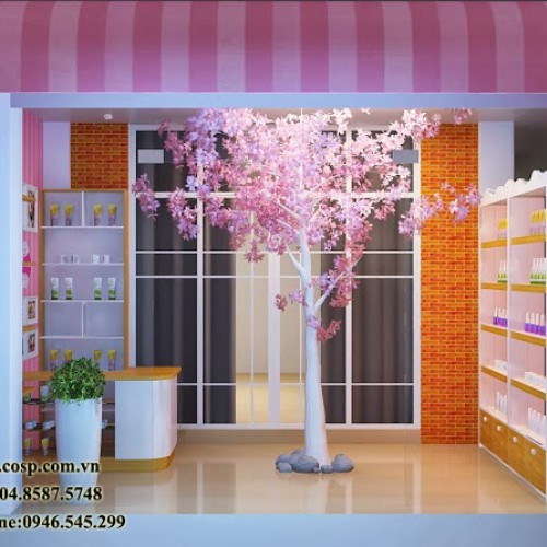 Vì diện tích có hạn nên chúng tôi không mong muốn cầu kỳ nhiều trong các mẫu nội thất cửa hàng mỹ phẩm. Đơn giản, hiện đại nhất có thể sẽ là phong cách Nhật Bản bạn có thể thấy trong mẫu thiết kế này. Cụ thể hơn chính là cây hoa anh đào ở kia chúng thể hiện một phong cách lãng mạn cùng sự dịu dàng.
