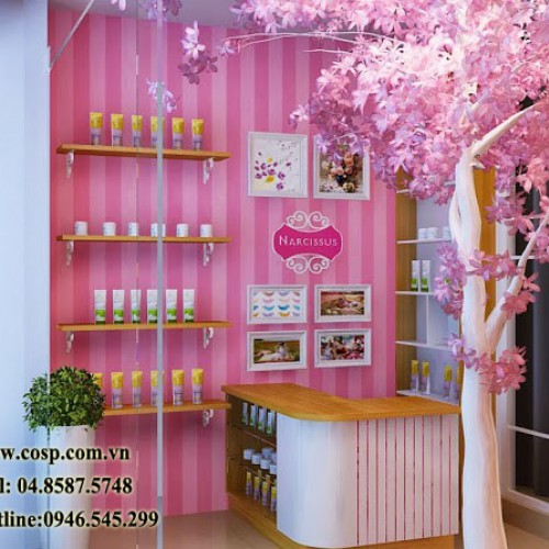 Ý tưởng thiết kế cửa hàng: Vì là cửa hàng chuyên kinh doanh mặt hàng mỹ phẩm chăm sóc sắc đẹp cho chị em, chị Thủy Tiên muốn đem lại cảm giác tự nhiên, thoải mái cho khách hàng ghé thăm. Gam màu chủ đạo của cửa hàng là hồng phấn với điểm nhấn là hệ thống kệ, giá vân gỗ tự nhiên.