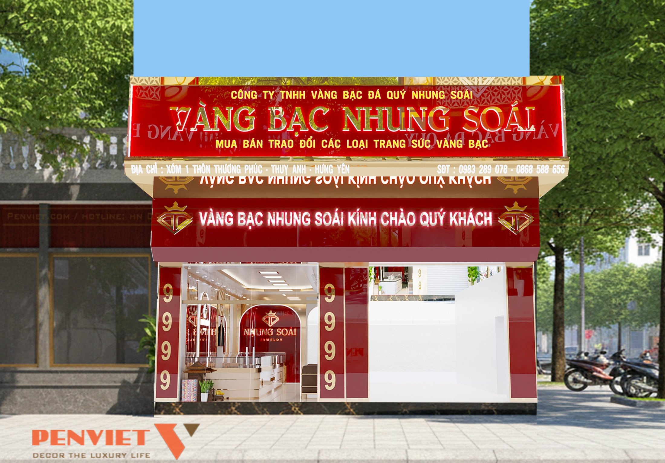 Mặt tiền TIỆM VÀNG NHUNG SOÁI sử dụng gam đỏ chủ đạo kết hợp chi tiết ánh kim sang trọng. Bảng hiệu lớn, rõ ràng giúp thương hiệu nổi bật trên tuyến phố đông người qua lại. Ánh sáng mặt tiền được bố trí hợp lý, giúp cửa hàng luôn nổi bật cả ban ngày lẫn ban đêm. Đây là điểm mạnh quan trọng trong việc thu hút khách hàng mới.