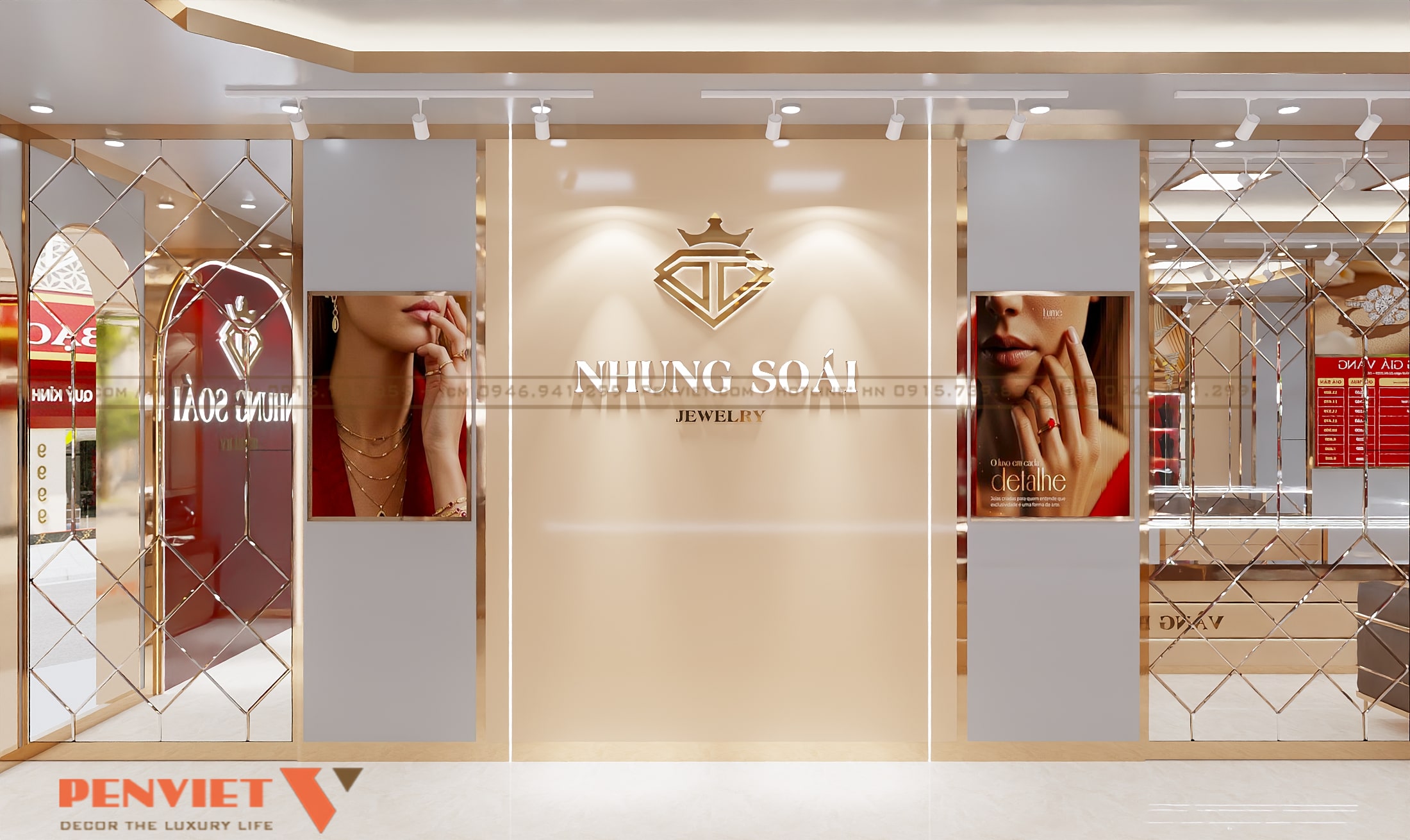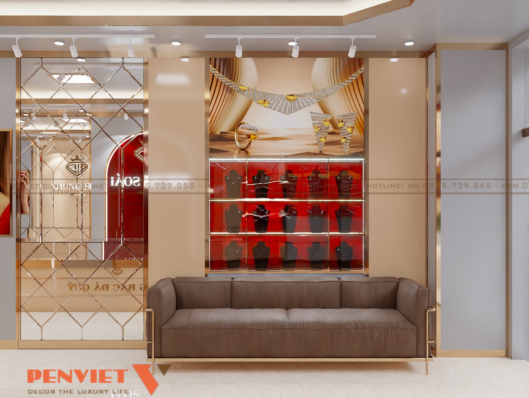 Phong cách hiện đại của TIỆM VÀNG NHUNG SOÁI thể hiện qua đường nét dứt khoát và vật liệu cao cấp. Trần nhà được xử lý phẳng, kết hợp hệ đèn chiếu sáng đồng đều. Ánh sáng trắng trung tính giúp sản phẩm vàng bạc nổi bật và đúng màu sắc. Điều này trực tiếp ảnh hưởng đến quyết định mua của khách hàng.