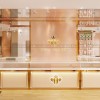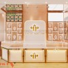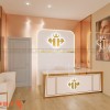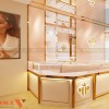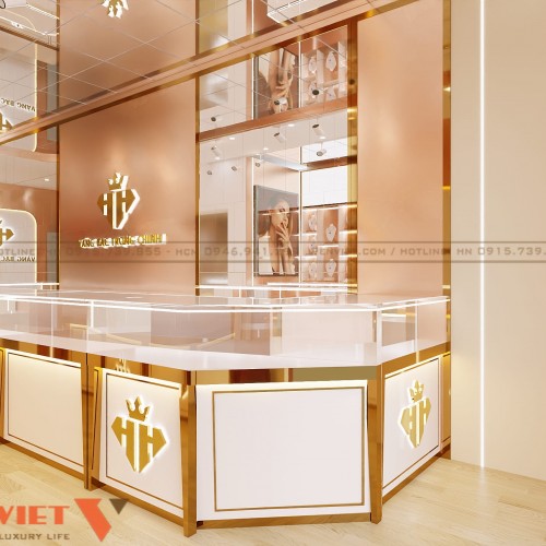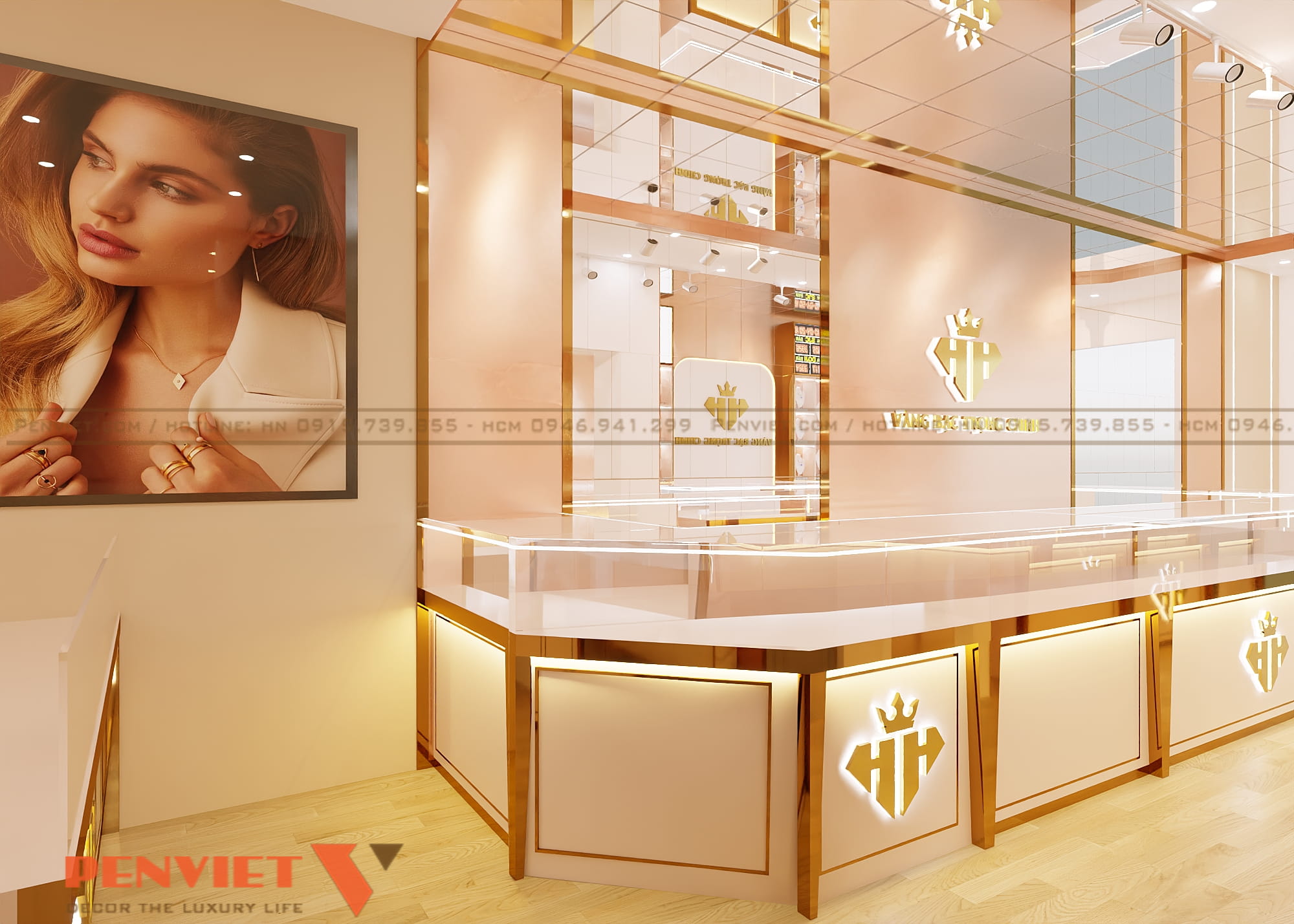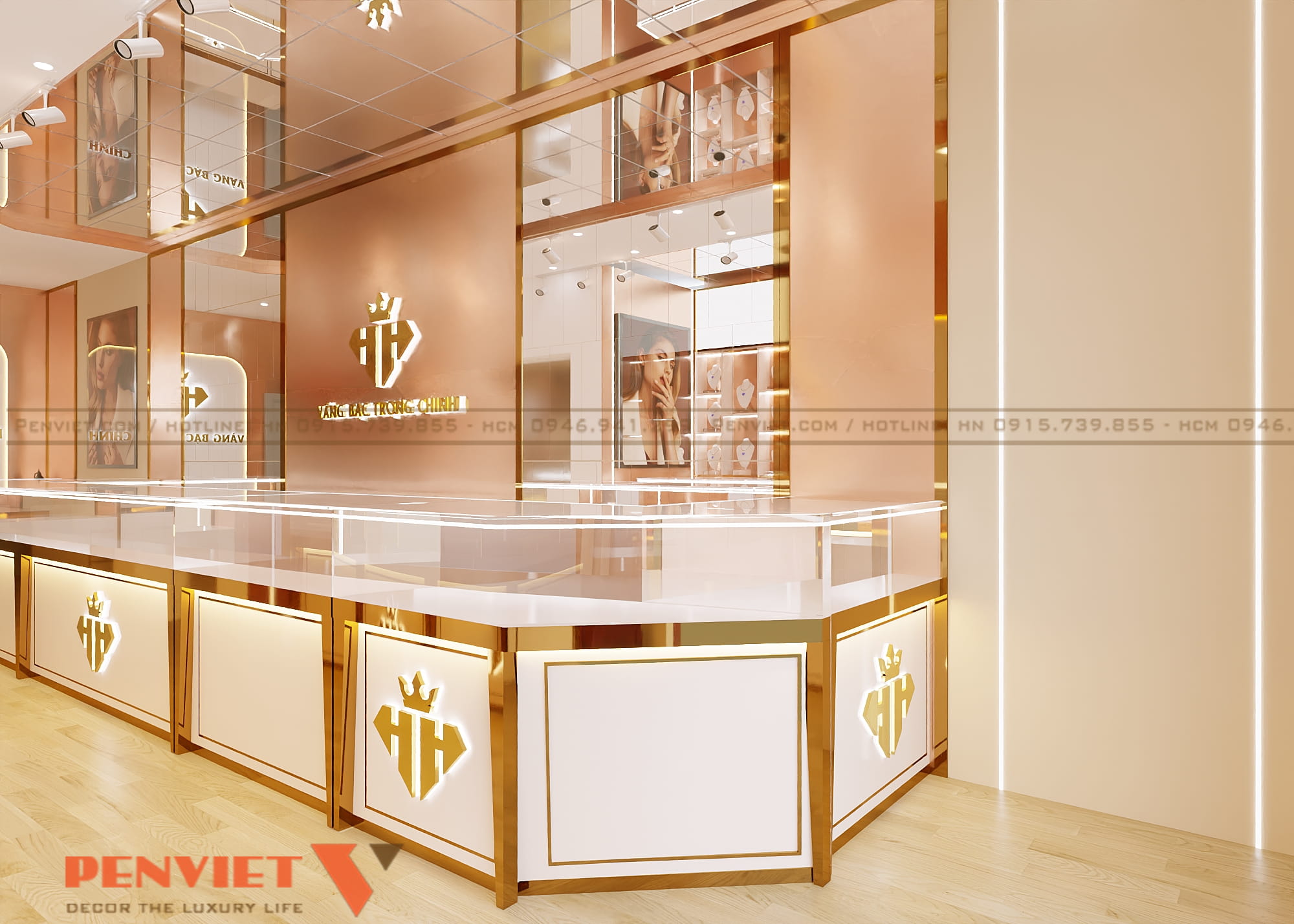 Nội thất dự án sử dụng đường nét gọn gàng, bề mặt phẳng và các chi tiết kim loại mạ vàng sáng bóng. Tông màu chủ đạo là vàng champagne kết hợp trắng kem, mang lại cảm giác sang trọng nhưng không quá nặng nề. Đây là lựa chọn phù hợp cho các tiệm vàng muốn hướng đến hình ảnh cao cấp, hiện đại.