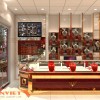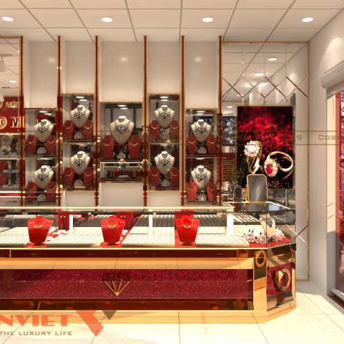 Bố trí đèn rọi ánh sáng trắng vàng, giúp làm nổi bật sắc độ của trang sức, đặc biệt là vàng tây, vàng Ý và đá quý. Tạo nên bức tường ánh sáng lấp lánh, giúp cửa hàng luôn sáng sủa và thu hút ánh nhìn từ mọi góc độ.