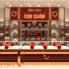 Phần chân tủ được ốp inox mạ PVD ánh vàng, phối hợp hài hòa cùng nền đỏ ánh kim đồng nhất với màu thương hiệu Kim Quân.