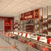 Hai vách bên sử dụng hệ tủ treo tường cao sát trần, vừa tận dụng tối đa diện tích trưng bày, vừa đảm bảo hiệu ứng thị giác dày đặc.
