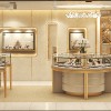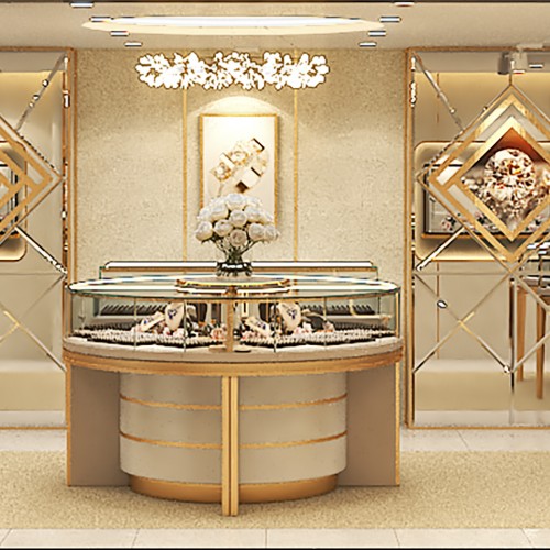 Thiết kế quầy trưng bày được làm từ kính cường lực, tạo nên sự an toàn và giúp làm nổi bật trang sức đá quý. Kính cũng có công dụng phản chiếu ánh sáng. Khu vực trưng bày trung tâm là mẫu kệ bo tròn tạo điểm nhấn mềm mại cho toàn bộ không gian. Ngoài ra còn có các mẫu kệ đơn kiểu dáng lạ mắt, độc đáo với chân inox mạ vàng tạo điểm nhấn.