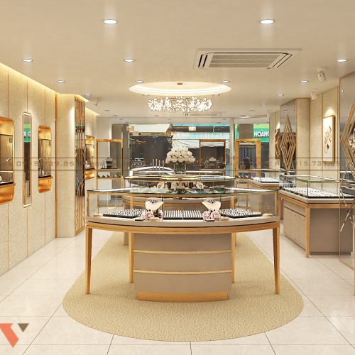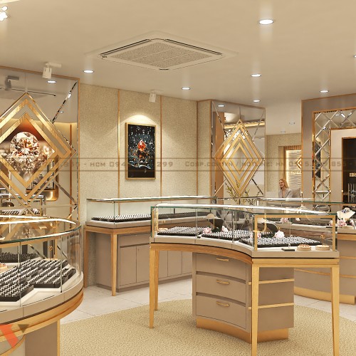 Không gian được chia rõ ràng, thuận tiện cho cả khách hàng và nhân viên trong quá trình tư vấn, lựa chọn trang sức. Tủ trưng bày đa dạng kiểu dáng, phù hợp với nhiều loại sản phẩm từ trang sức nhỏ gọn đến các bộ sưu tập lớn.