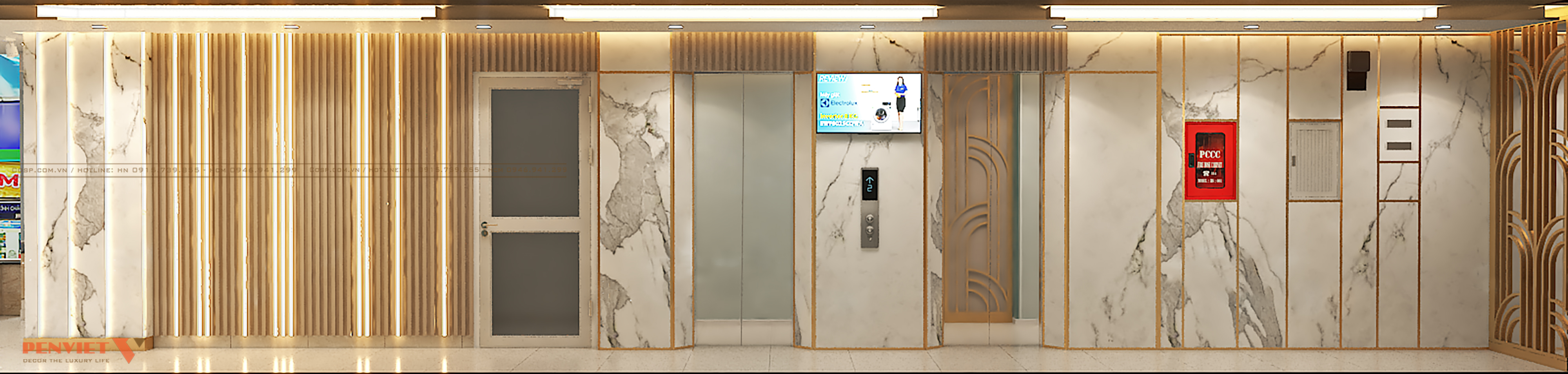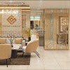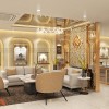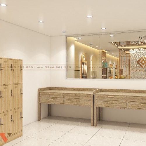 Nằm gần khu vực trưng bày nhưng tách biệt khéo léo bằng vách ngăn kim loại mạ vàng và họa tiết uốn lượn tinh xảo. Điều này tạo được sự riêng tư nhưng vẫn đảm bảo liên kết với tổng thể không gian.