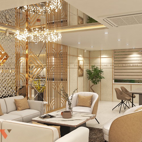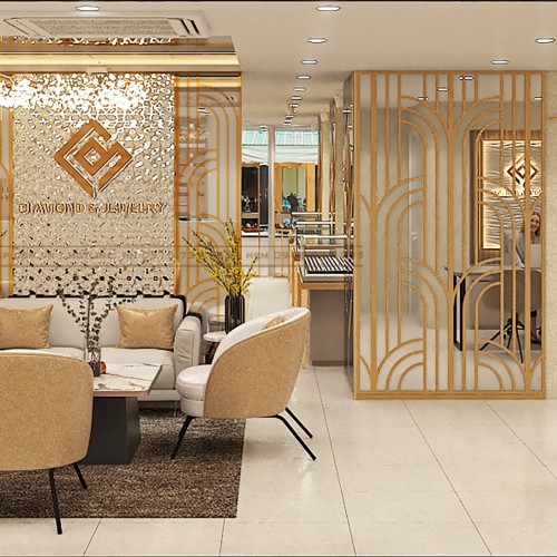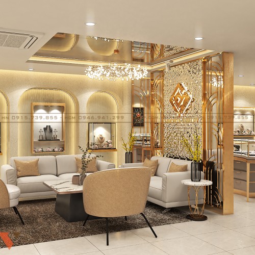 Dự án được thực hiện theo phong cách thiết kế hiện đại tôn vinh vẻ đẹp cao cấp của trang sức đá quý. Những vật liệu được sử dụng bao gồm kính cường lực, gỗ và kim loại mạ vàng. Mỗi yếu tố đều được sắp xếp hài hòa để tạo nên một không gian tinh tế, thu hút.