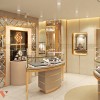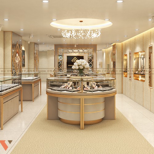 Tông màu vàng champagne chủ đạo kết hợp với be và trắng tạo nên không gian sang trọng nhưng vẫn tinh tế. Sử dụng kính cường lực để tăng cường độ bền và đảm bảo hiển thị rõ ràng các chi tiết tinh xảo của trang sức đá quý.