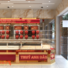 Khi bước vào tiệm vàng Thúy Anh Đào, ấn tượng đầu tiên chính là không gian rộng rãi, sang trọng. Sự phối hợp màu sắc chủ đạo là vàng ánh kim, đỏ làm nổi bật vẻ đẹp quý phái và tinh tế. Trần nhà được thiết kế với hệ thống đèn LED âm trần tạo ánh sáng đồng đều, giúp làm nổi bật sự lấp lánh của các sản phẩm trưng bày.