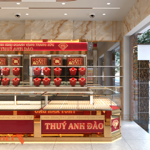Thiết kế tiệm vàng Thúy Anh Đào có sự chú trọng vào từng chi tiết nhỏ như viền mạ vàng trên tủ hay vách kính trang trí. Tất cả đều phản ánh sự chuyên nghiệp và tâm huyết của chủ cửa hàng cũng như PenViet. Hãy liên hệ PenViet ngay hôm nay nếu bạn muốn sở hữu không gian kinh doanh ấn tượng như Thúy Anh Đào.