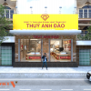 Tiệm vàng Thúy Anh Đào có khu vực mặt tiền nổi bật với màu vàng tươi mới của hệ biển bảng quảng cáo. Thông tin tên thương hiệu có font chữ đơn giản, màu đỏ trên nền Alu vàng. Đây là hai màu sắc đại diện cho sự quý phái của các cửa hàng kinh doanh trang sức.