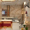 Một yếu tố đặc biệt trong thiết kế nội thất của tiệm vàng Thúy Anh Đào là việc sử dụng các vách gương trang trí và hệ tủ treo tường. Gương tạo hiệu ứng thị giác mở rộng không gian, làm cho tiệm vàng trở nên rộng rãi và thoáng đãng hơn. Các vách gương được lắp đặt khéo léo phản chiếu ánh sáng và màu sắc, tạo nên không gian lung linh và ấn tượng.